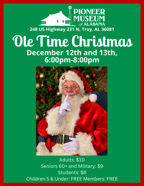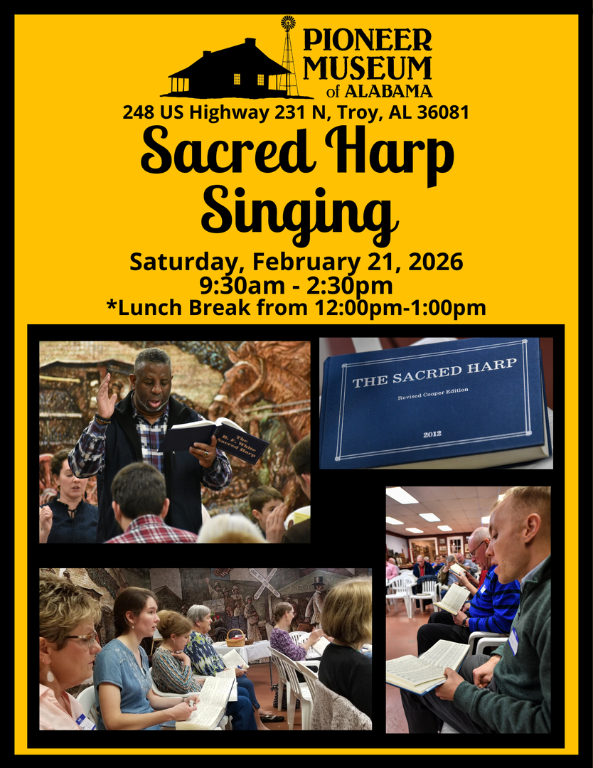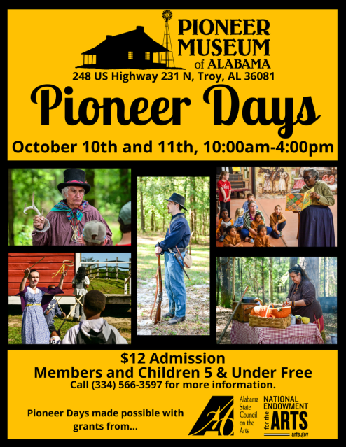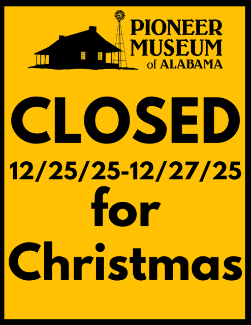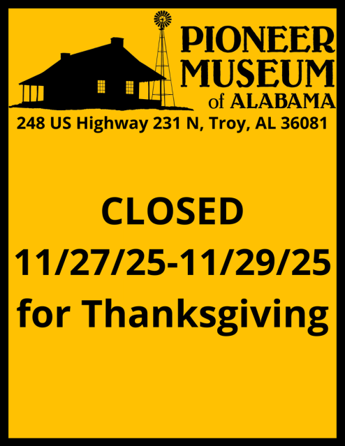 The Pioneer Museum of Alabama interprets prehistoric Alabama as well as 19th and early 20th century rural life. Over twenty-two historic structures and eighteen thousand artifacts illustrate this rich, rustic heritage. Four thematic exhibition halls within the Main Gallery display historic farm equipment, textile arts such as quilting and weaving, material culture of pioneer Alabama, the archaeology of Southeastern Native Americans, militaria including Civil War and WWI, and Victorian Era Troy.